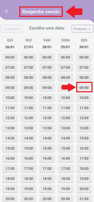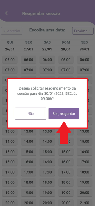 Ao selecionar o botão “Reagendar”, identificado pelo ícone de calendário, o paciente poderá escolher uma nova data e horário e enviar a solicitação.