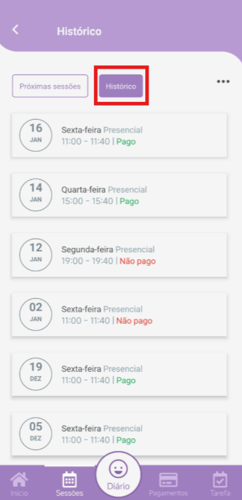 No menu inferior, ao acessar a opção “Sessões”, o paciente pode: