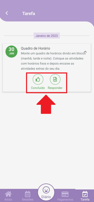 - Após responder, ao clicar novamente na seta, o paciente poderá marcar a tarefa como “Concluída”.