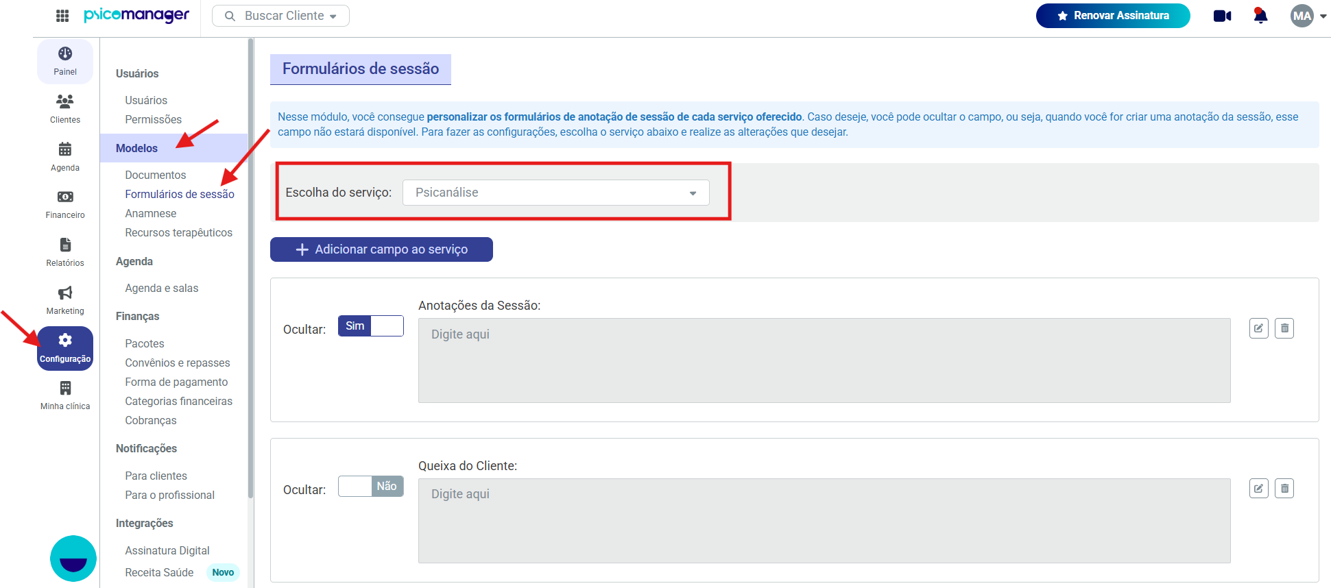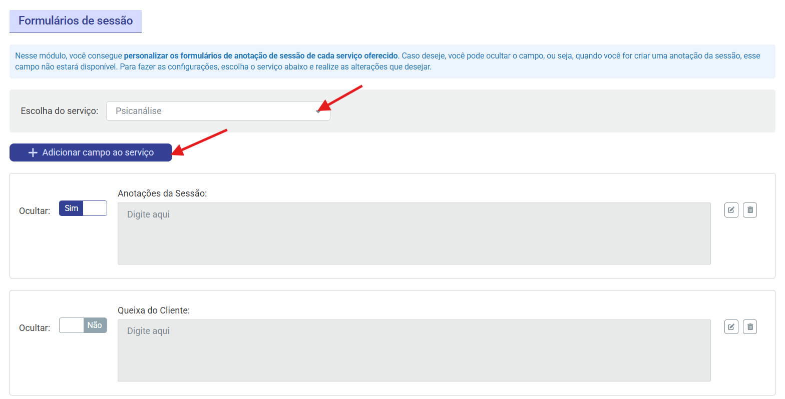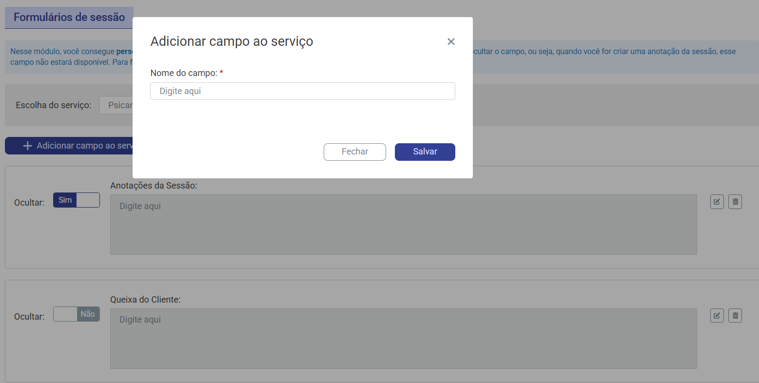 Nesse ambiente, é possível personalizar os campos de anotação de sessão para cada serviço (abordagem) cadastrado na plataforma. Caso necessário, também é possível ocultar campos, fazendo com que eles não sejam exibidos no momento do preenchimento da anotação da sessão, bem como excluir os campos que não deseja disponibilizar.