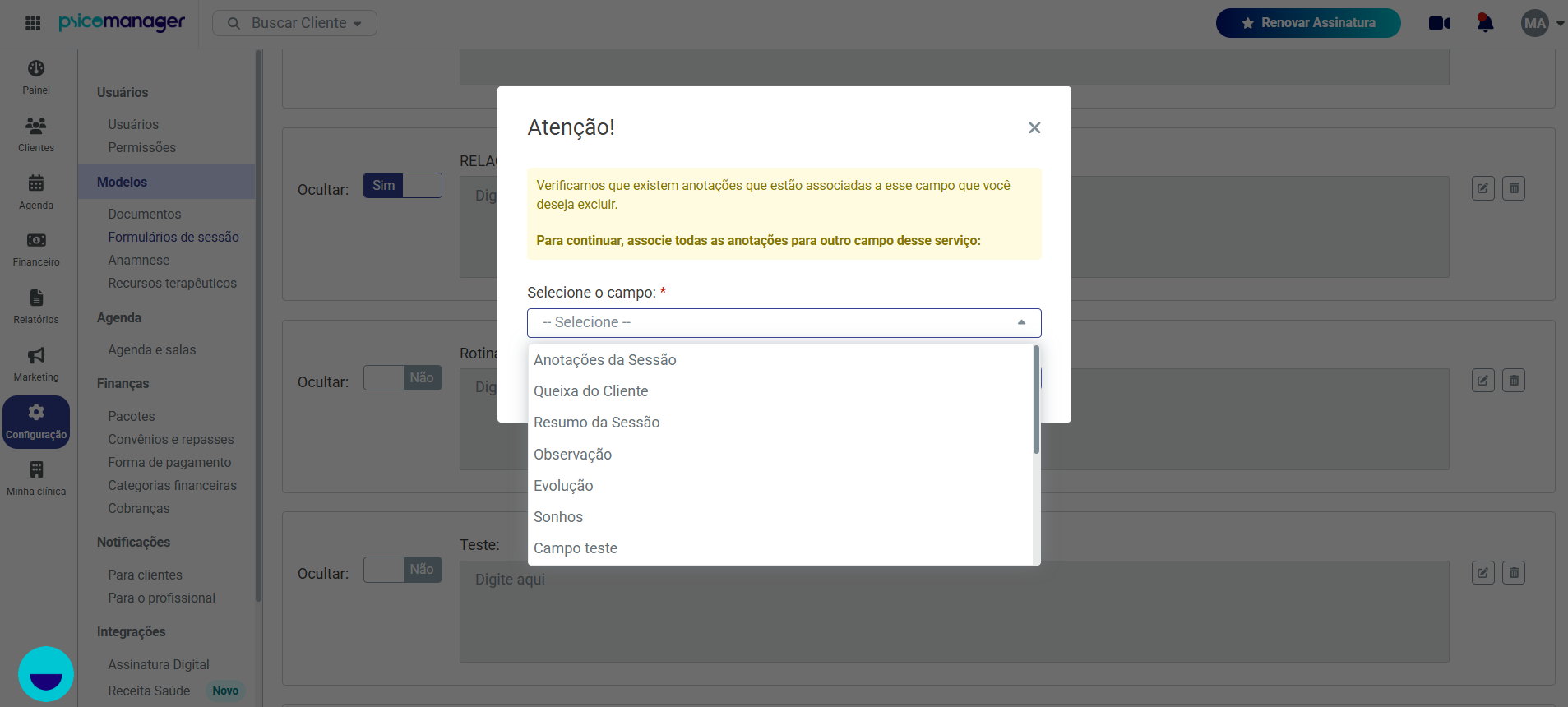 Importante: Ao tentar excluir um campo que já possua anotações registradas na ficha de algum paciente, o sistema exibirá uma mensagem solicitando que essas anotações sejam vinculadas a outro campo do mesmo serviço (abordagem).