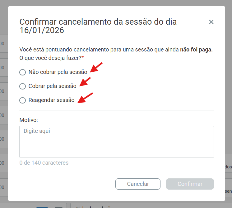 A confirmação e o cancelamento de sessões possuem comportamentos diferentes no sistema.