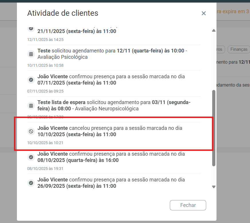 A confirmação de sessão permite validar uma sessão futura já agendada para o cliente, garantindo que o profissional tenha a confirmação prévia do atendimento.
