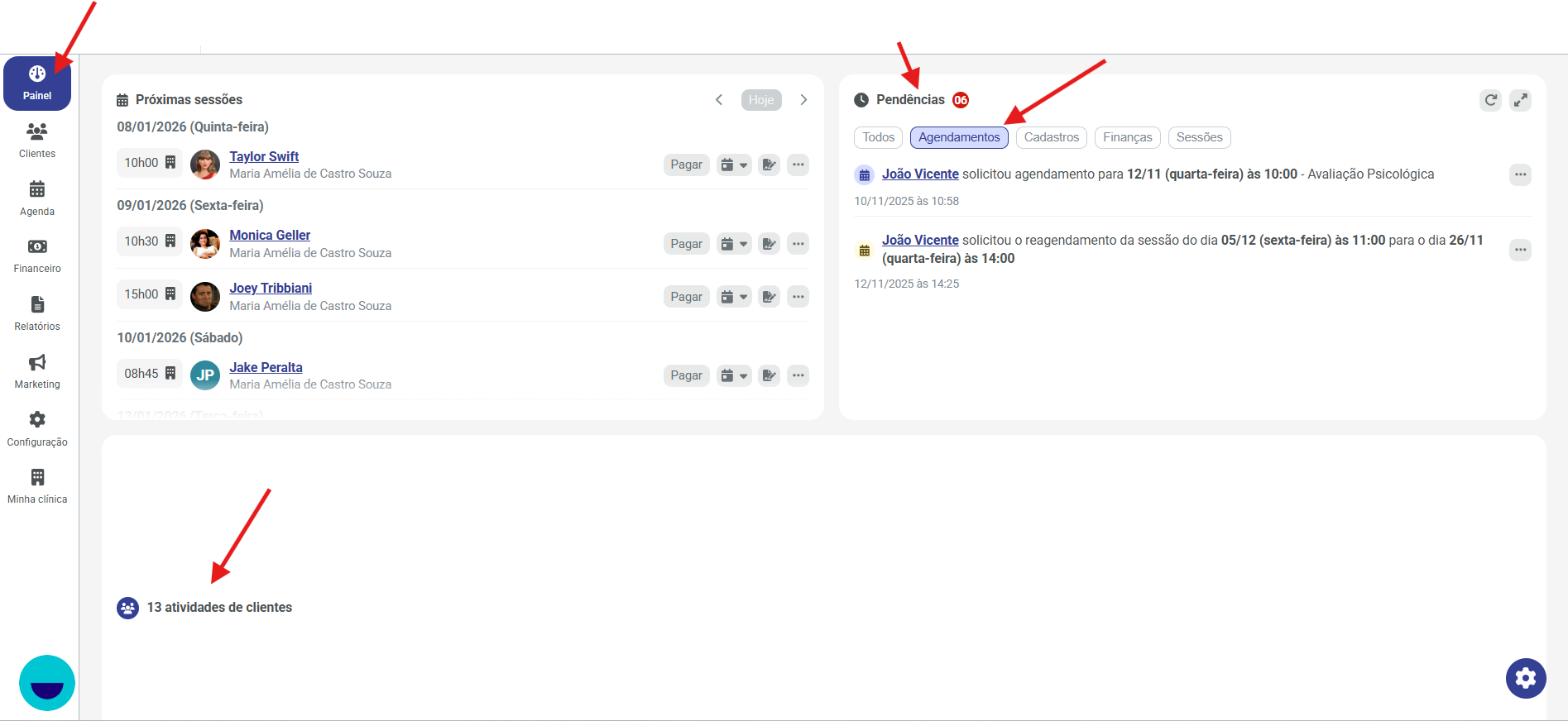 Você pode confirmar uma sessão futura tanto pela Agenda Geral quanto pela Ficha do Cliente.