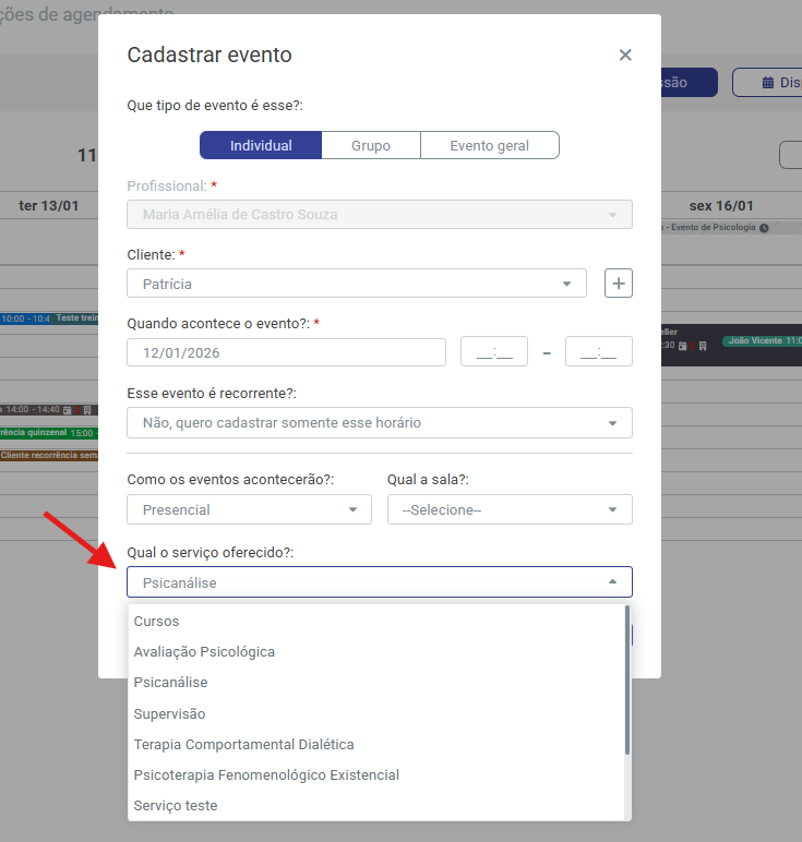 Ao cadastrar um horário de sessão, selecione o serviço desejado no campo correspondente do formulário de agendamento. Ao cadastrar um horário de sessão, é obrigatório vincular a sessão a um serviço. Essa seleção define quais campos de anotação estarão disponíveis para o registro da sessão.