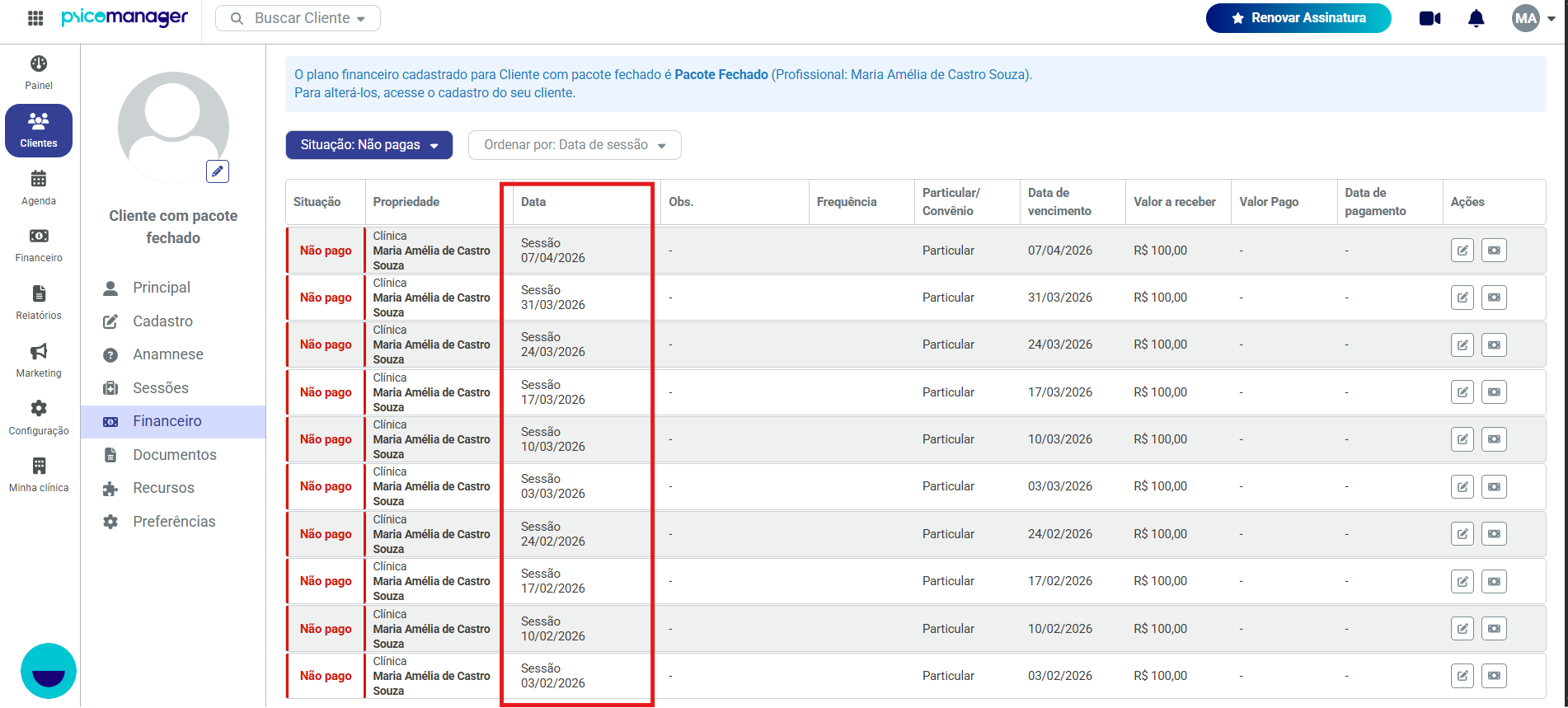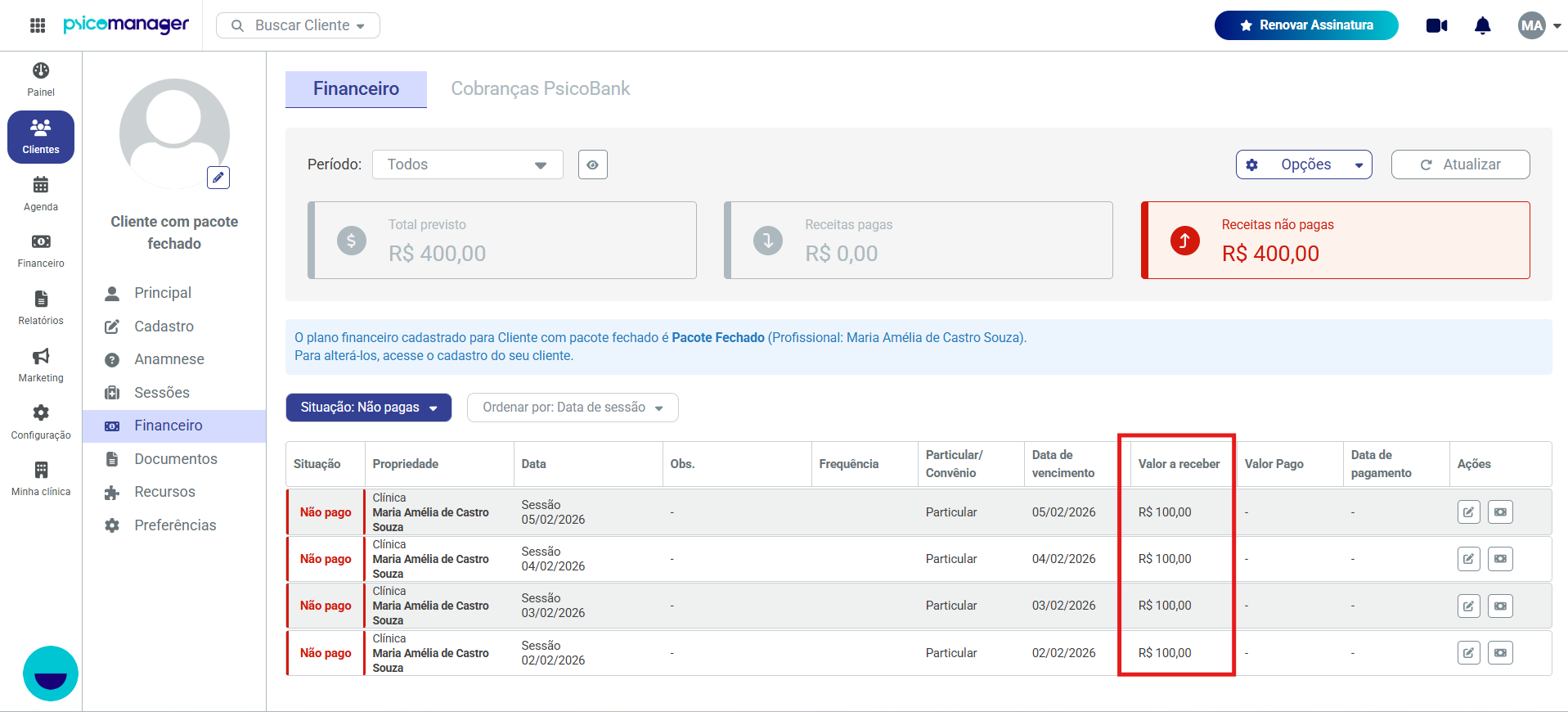 - O valor exibido por sessão será proporcional ao valor total do pacote dividido pela quantidade de sessões. Por exemplo, se o pacote com 4 sessões custa 400 reais, o valor por sessão será lançado como 100 reais cada sessão.