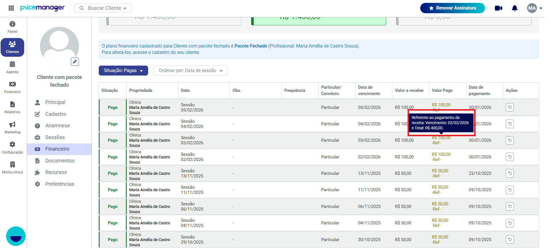 - Apresenta o valor individual por sessão nos relatórios financeiros, mantendo o controle correto de recebimentos.