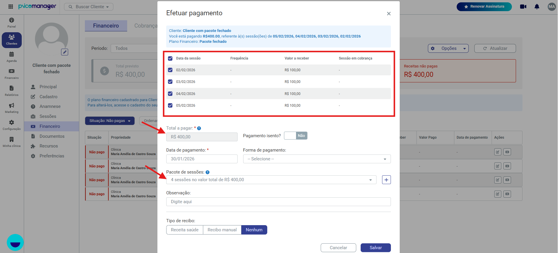 O pagamento por pacote é tratado pelo sistema como um pagamento único, que corresponde ao conjunto de sessões contratadas. Por isso, todas as sessões do pacote precisam estar corretamente lançadas e selecionadas no momento da baixa.