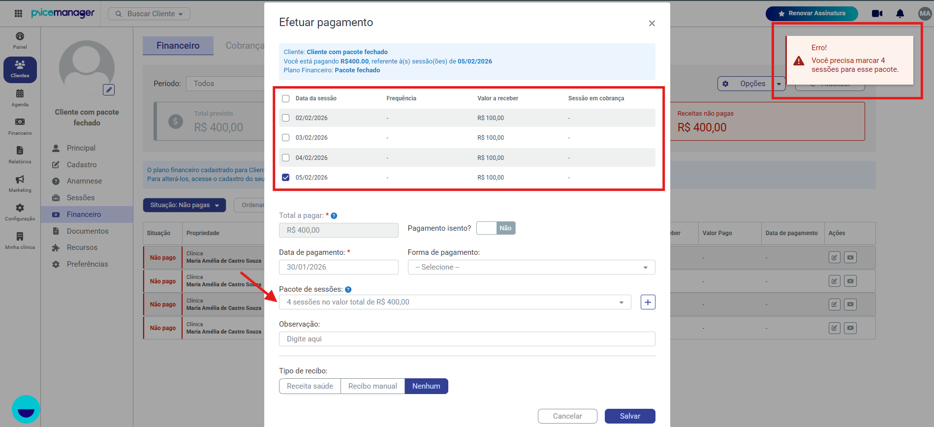 Para realizar a baixa de pagamento de sessões por pacote, é necessário que a quantidade de sessões lançadas para o paciente no sistema seja compatível com a quantidade definida no pacote fechado.
