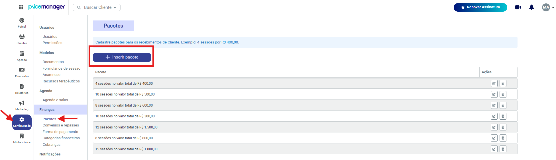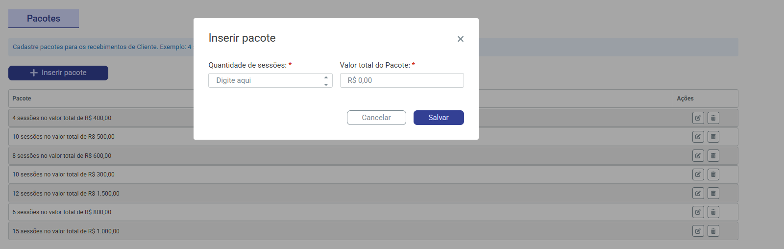 Antes de tudo, é necessário ter o pacote de sessões previamente cadastrado no sistema, com a quantidade de sessões e o valor total definidos.