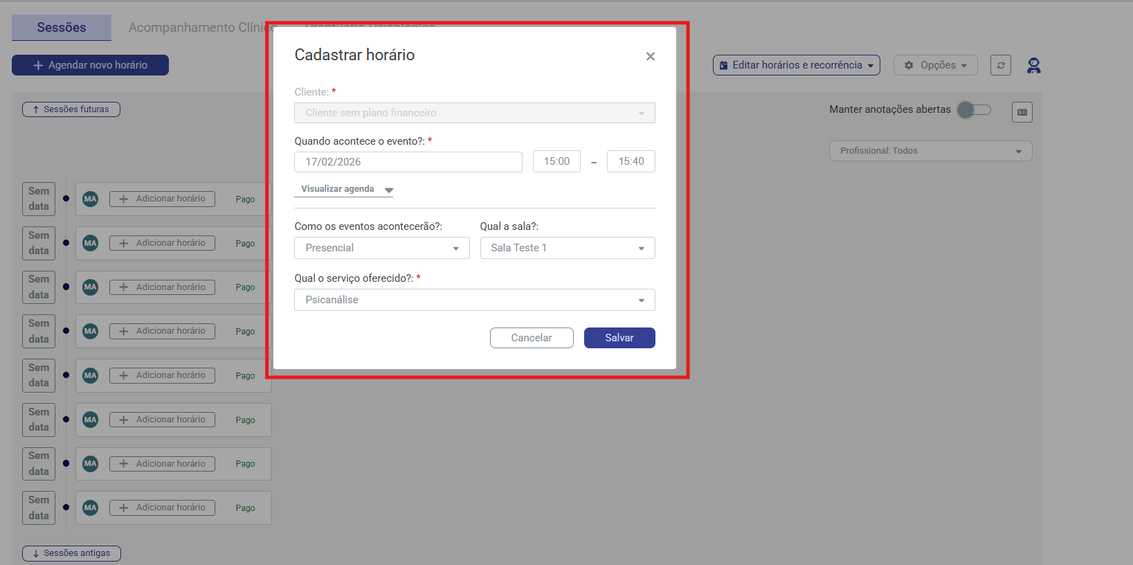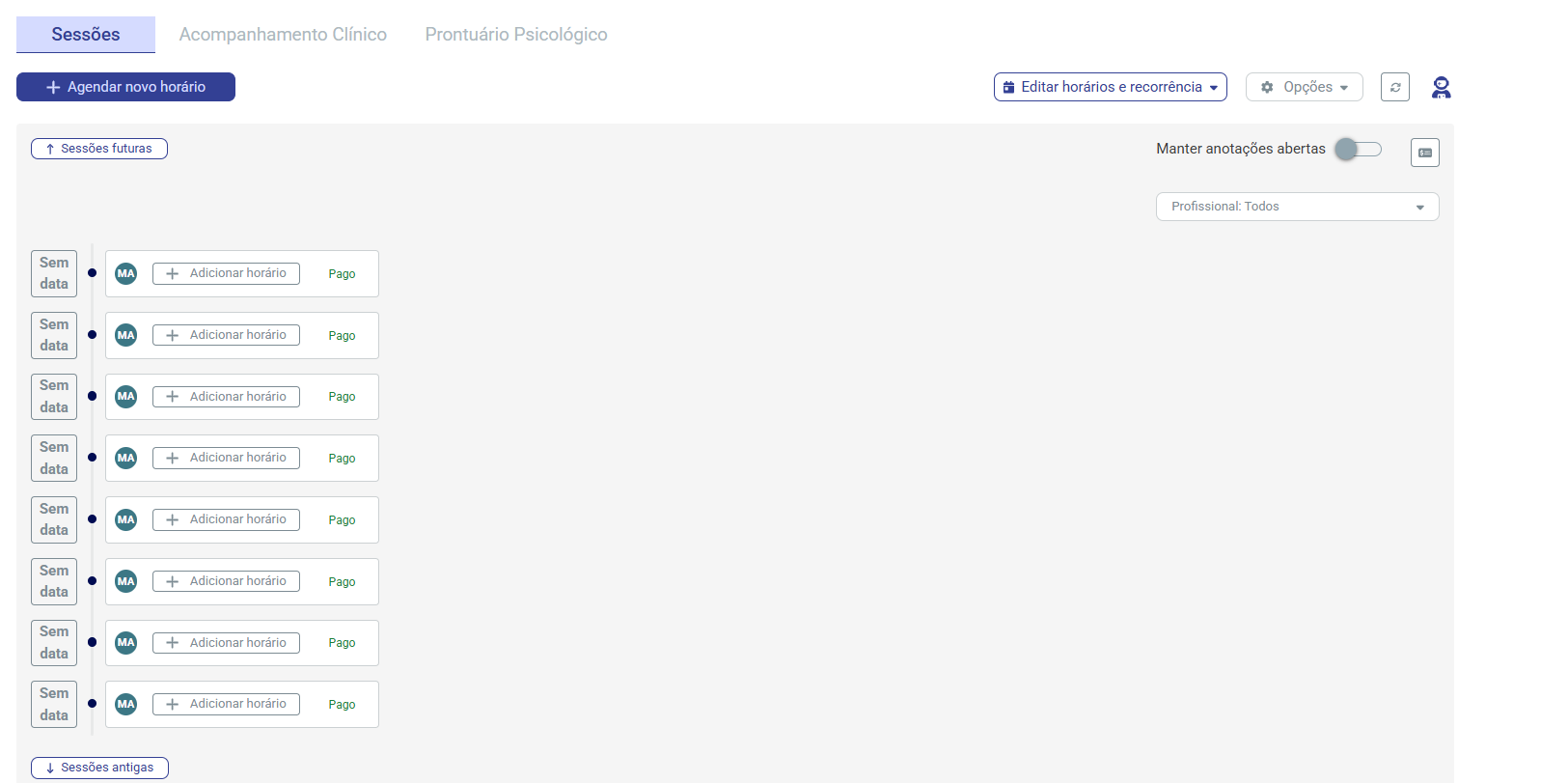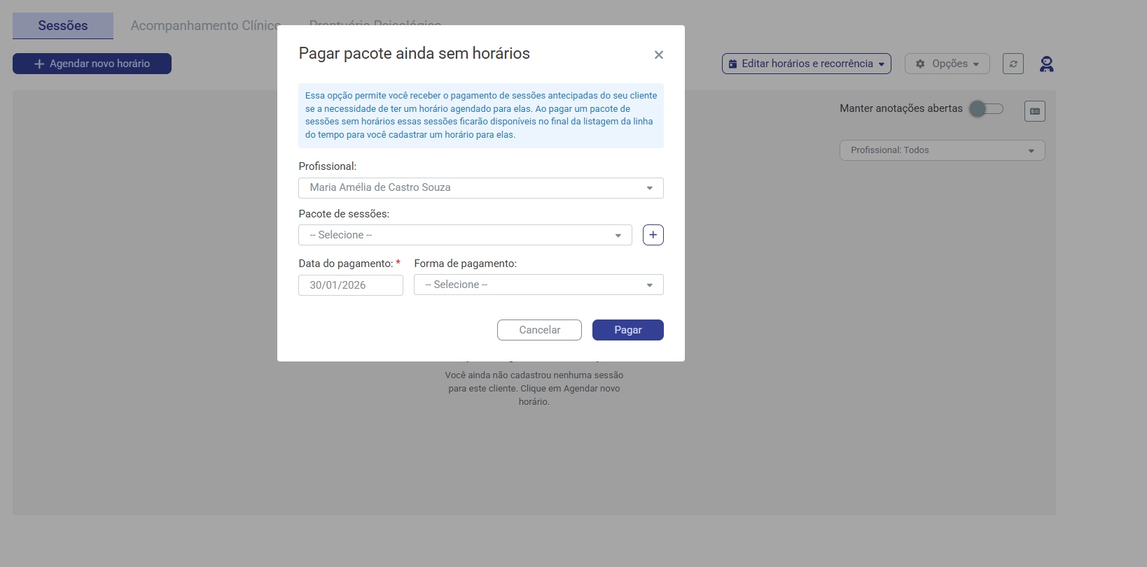 Dessa forma, o pagamento é registrado no sistema, e as sessões ficam como créditos disponíveis para que você inclua as datas conforme os atendimentos forem acontecendo.
