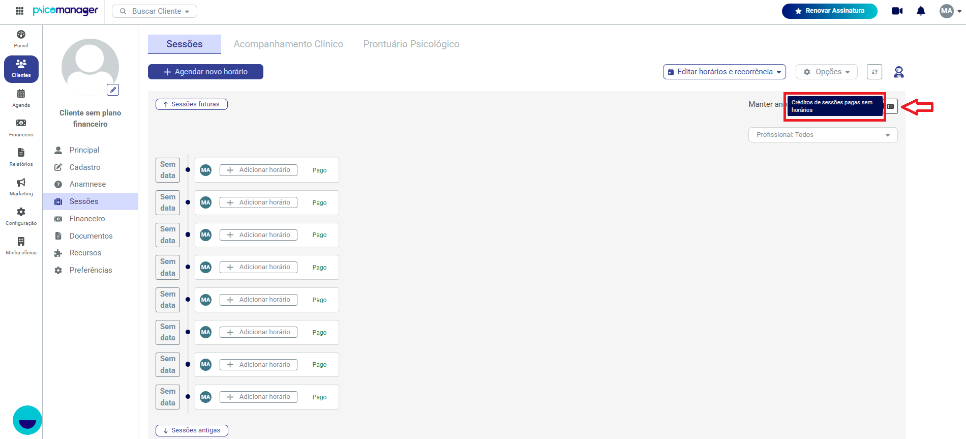 Outra forma de localizar as sessões pagas sem horário é utilizando o atalho de créditos de sessões.