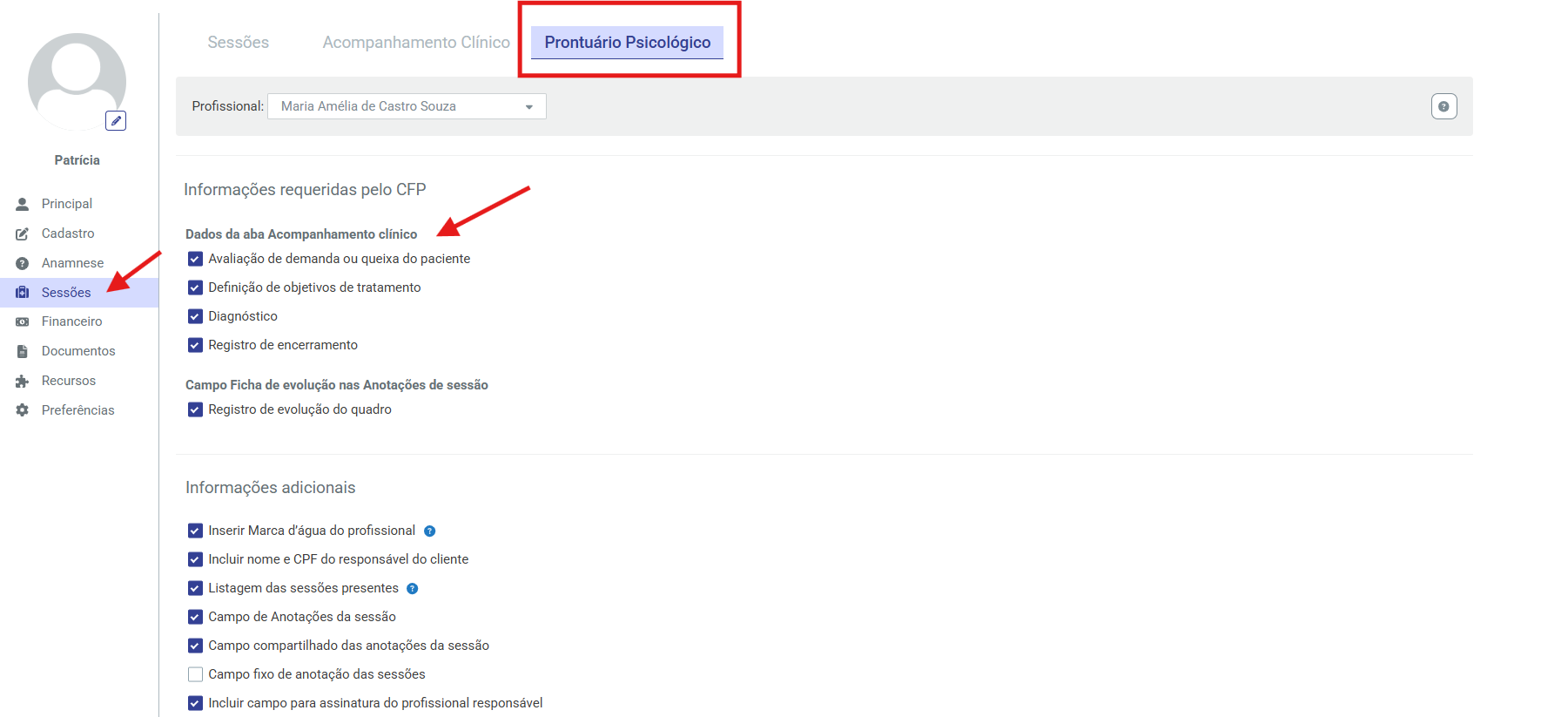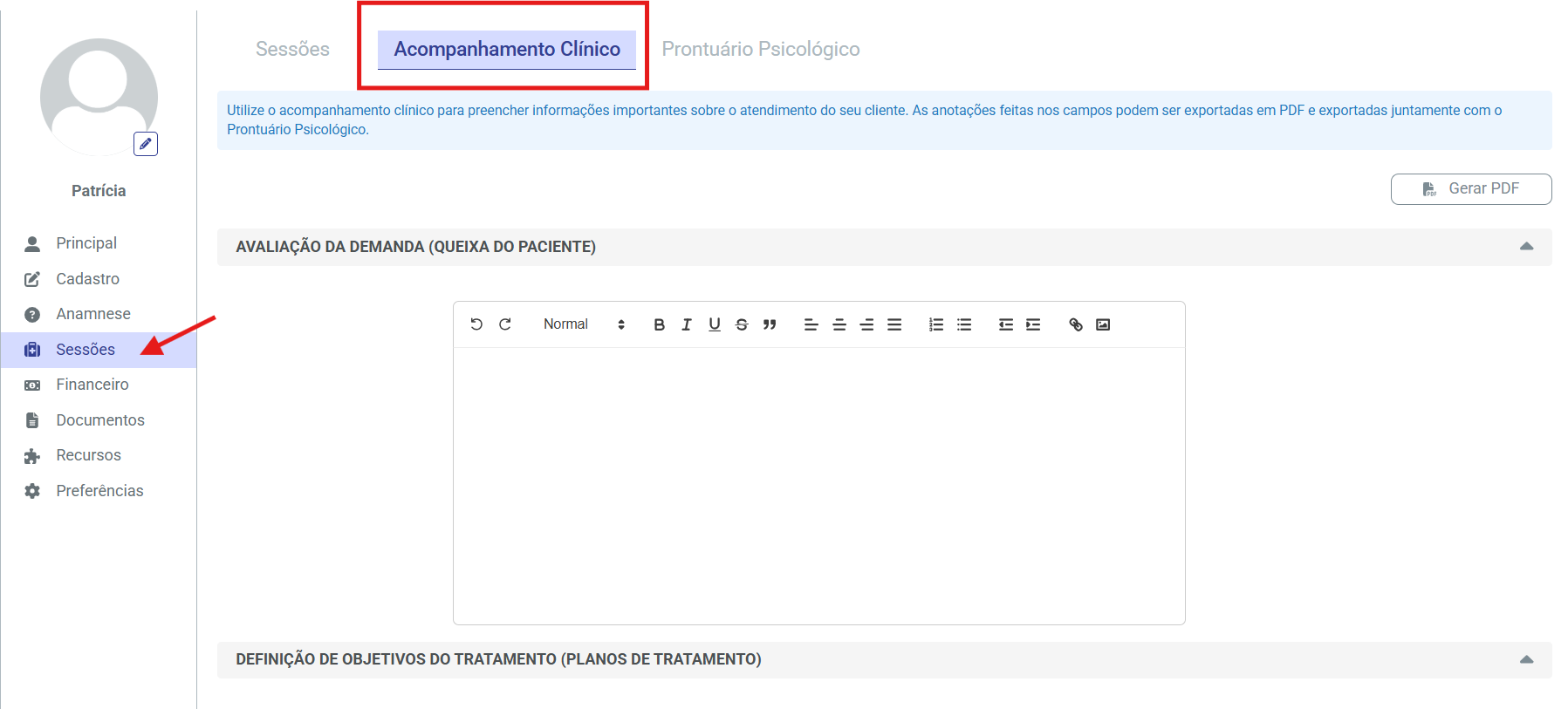 Como acessar: Ficha do Cliente > Menu Sessões > Prontuário Psicológico