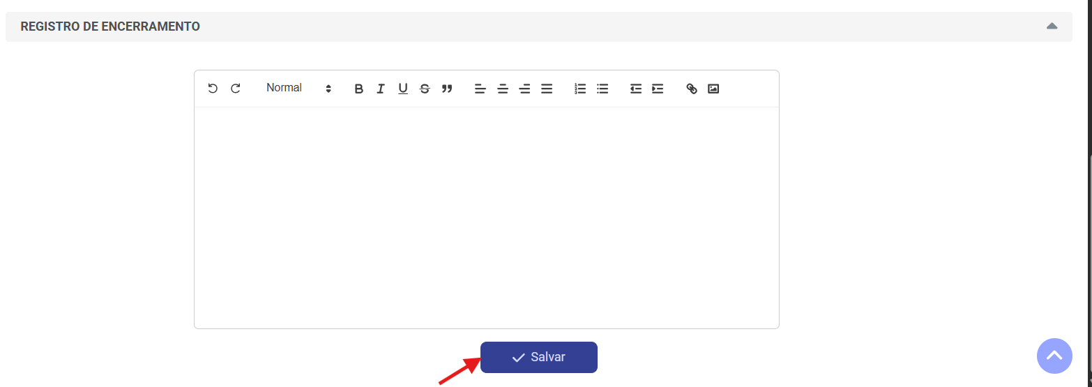 2º passo: Ao abrir cada campo do acompanhamento, inclua os registros pertinentes conforme a evolução do atendimento. Após o preenchimento, o sistema salva o que você digitou. Após finalizar todo o preenchimento, clique em Salvar, ao final da página.