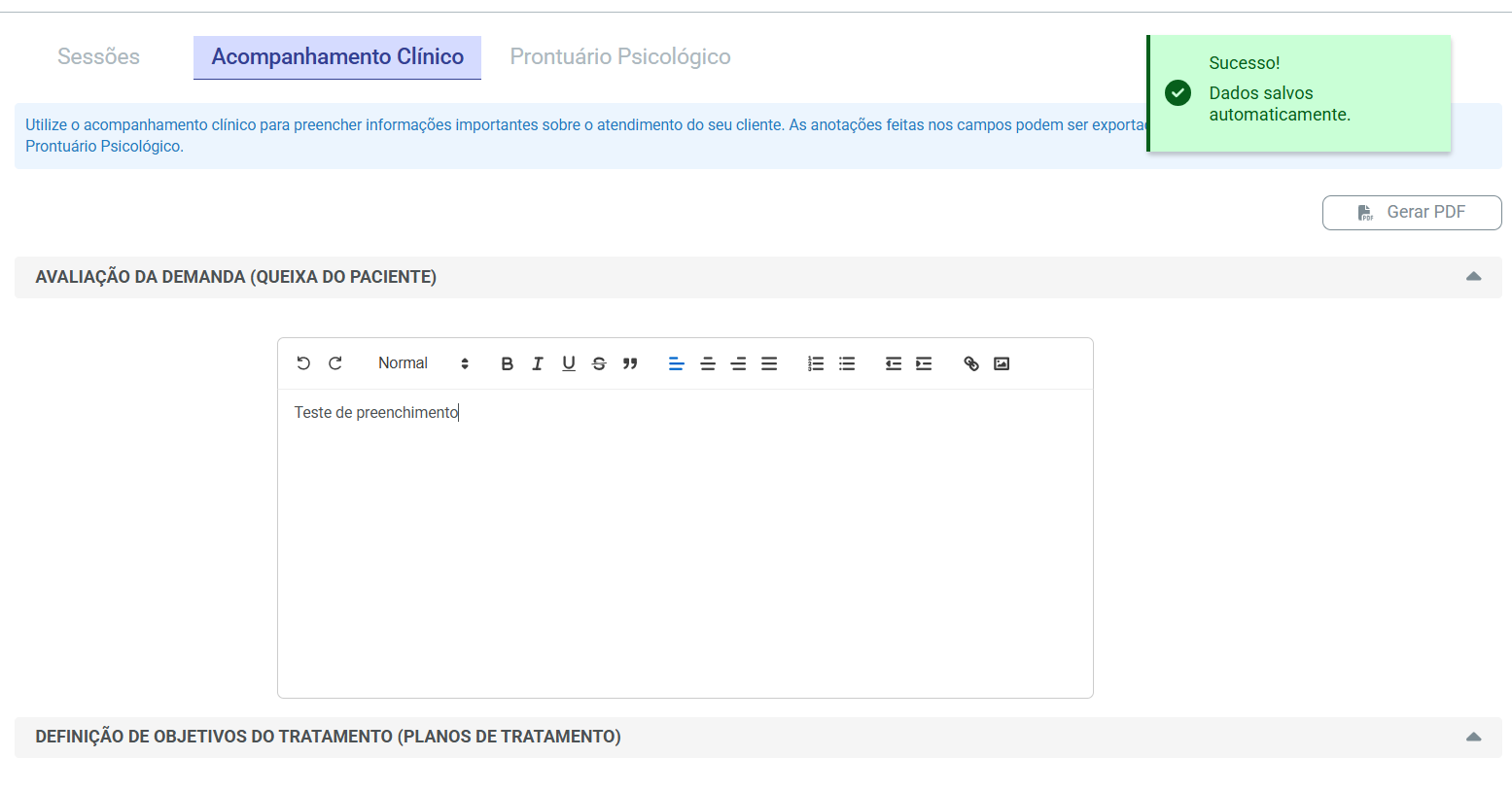 Como acessar: Ficha do Cliente > Sessões > Acompanhamento Clínico > Inserir Registro nos campos > Salvar